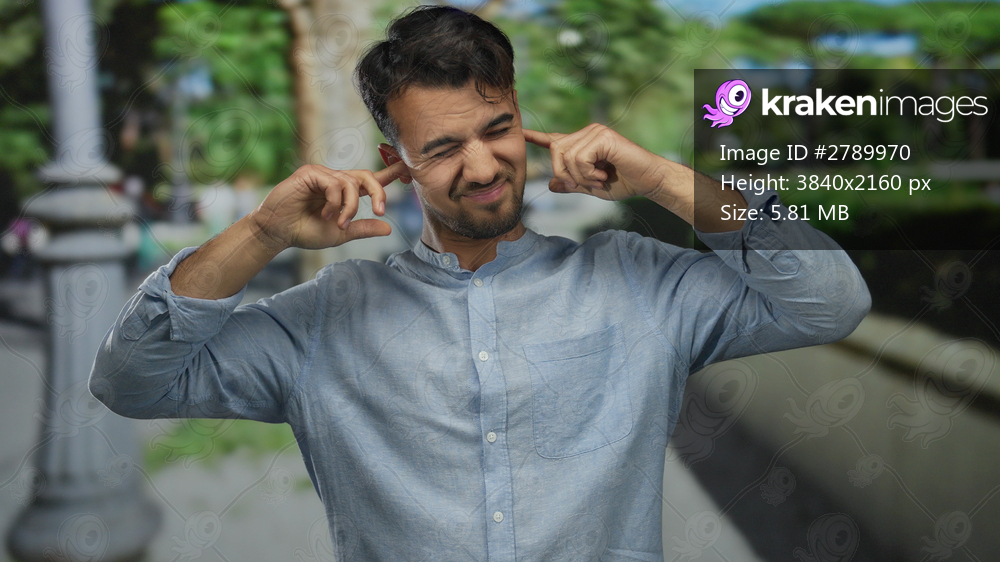 Young man making fun gestures mimicking speech in a city street surrounded by greenery and urban environment in daylight.