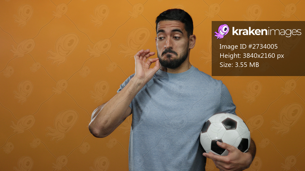 Young man making gestures while holding a soccer ball against an orange background offering a humorous and playful expression of surprise and jest.