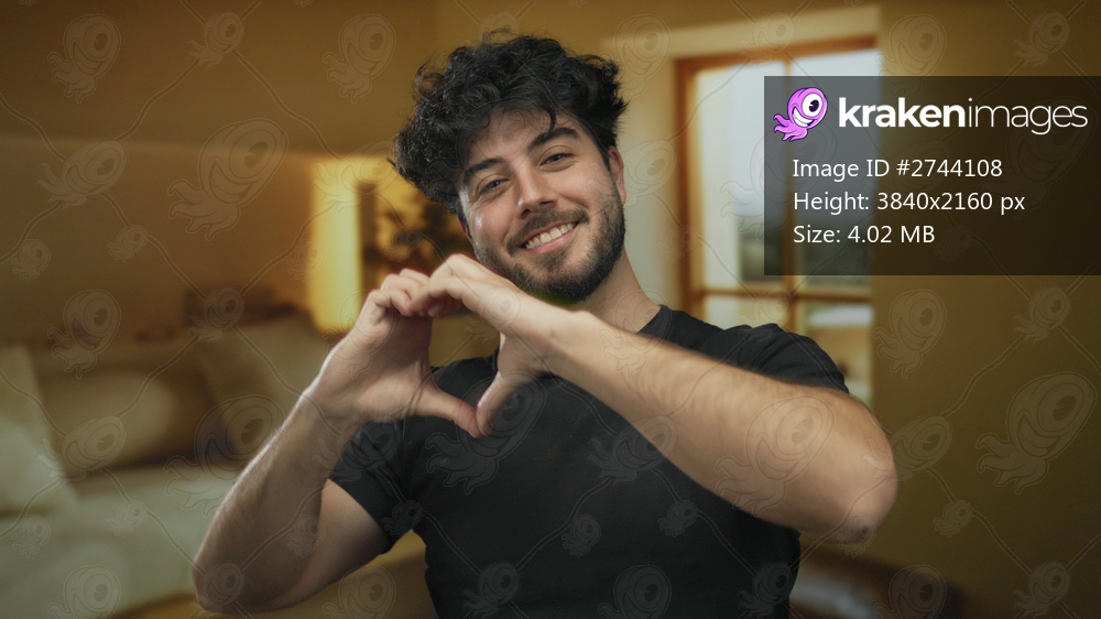 Young man making heart symbol with hands in cozy hotel room with large window and warm lighting, expressing happiness and positive emotion.