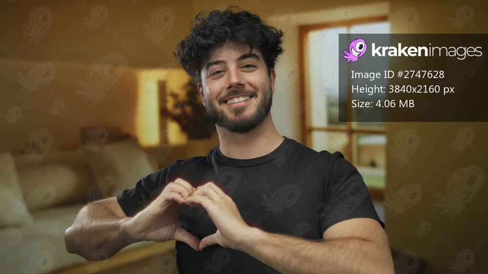 Young man making heart symbol with hands in cozy hotel room with large window and warm lighting, expressing happiness and positive emotion.