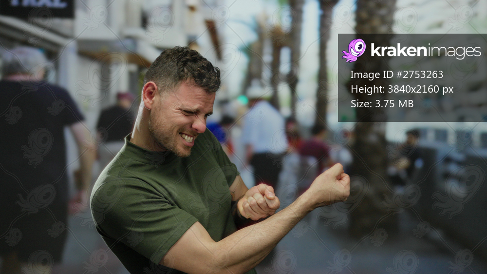 Young man making playful gesture outdoors on a bustling urban street showcasing lively city environment.