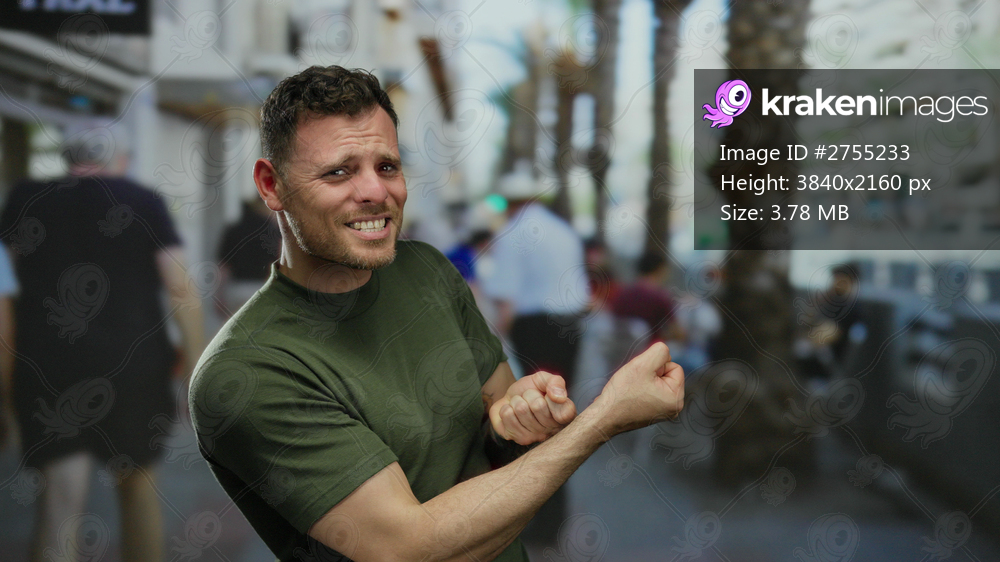 Young man making playful gesture outdoors on a bustling urban street showcasing lively city environment.