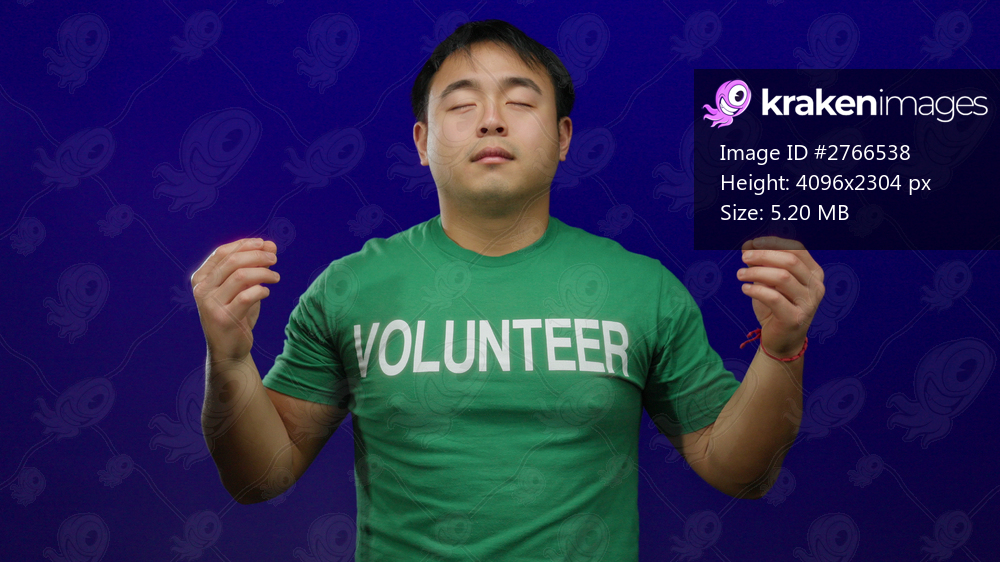 Young man meditates peacefully in a green volunteer shirt against a vivid blue background, evoking a sense of calm and focus.