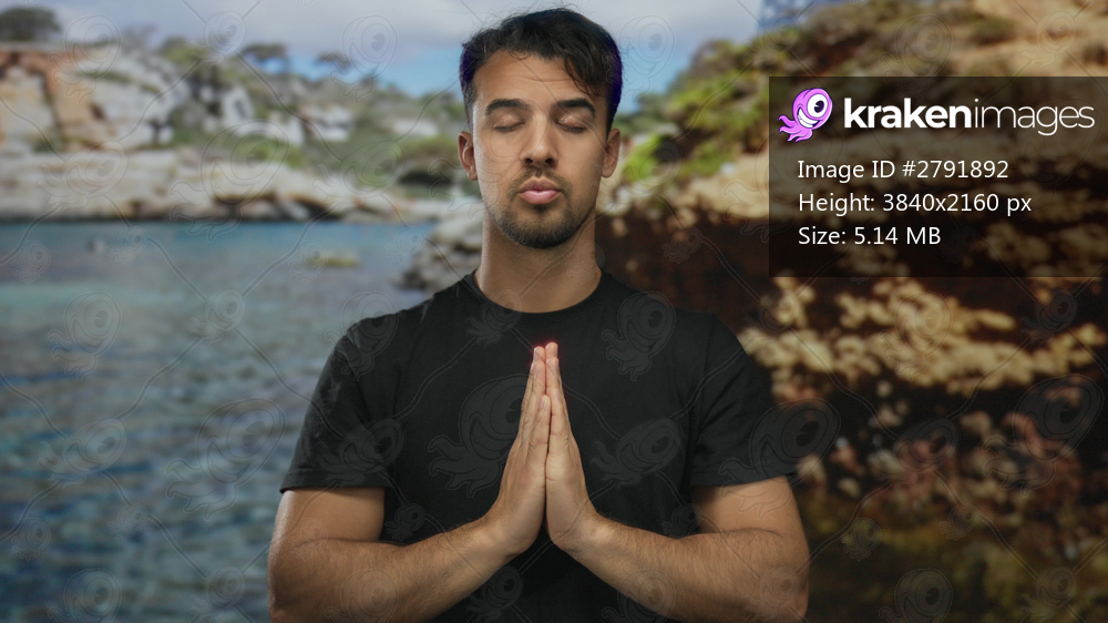Young man meditating with closed eyes near seaside showing peaceful expression surrounded by serene beach setting
