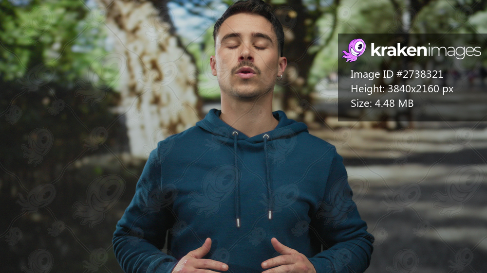 Young man meditating outdoors with closed eyes in a serene park setting, embodying calmness and relaxation, wearing blue hoodie with natural green background and sunlight. - Kraken Images