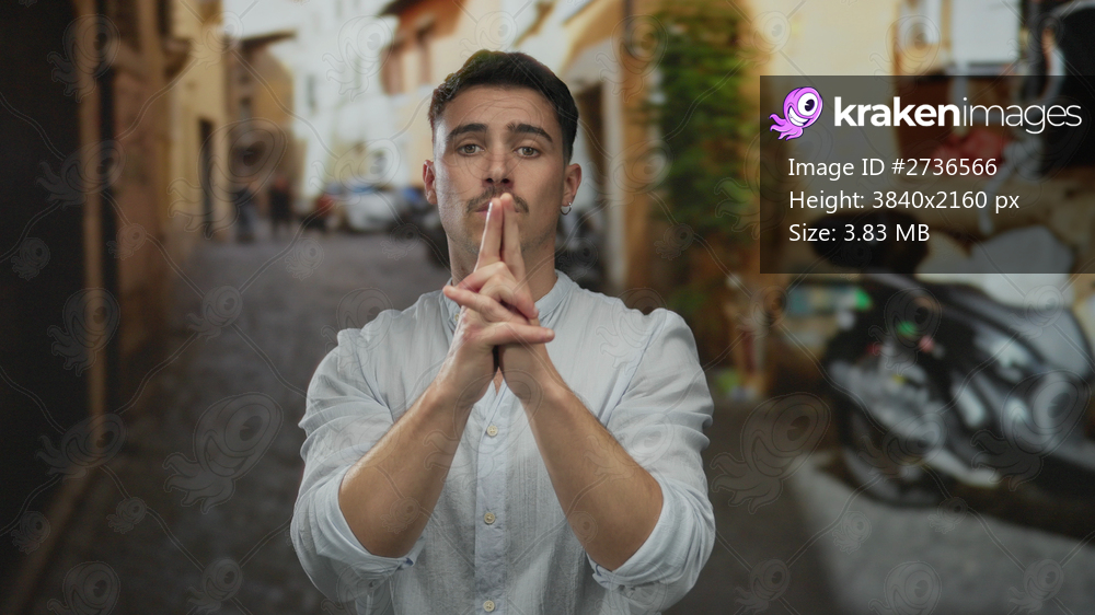 Young man mimicking a gun gesture with hands on a street in a vibrant city setting, showcasing playful expression and urban lifestyle amidst a backdrop of scooters and buildings. - Kraken Images