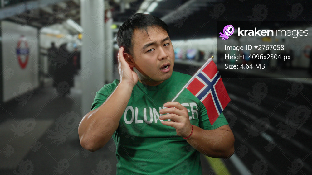 Young man with norwegian flag gesturing to listen in indoor railway station with blurred background and wearing a green volunteer shirt.