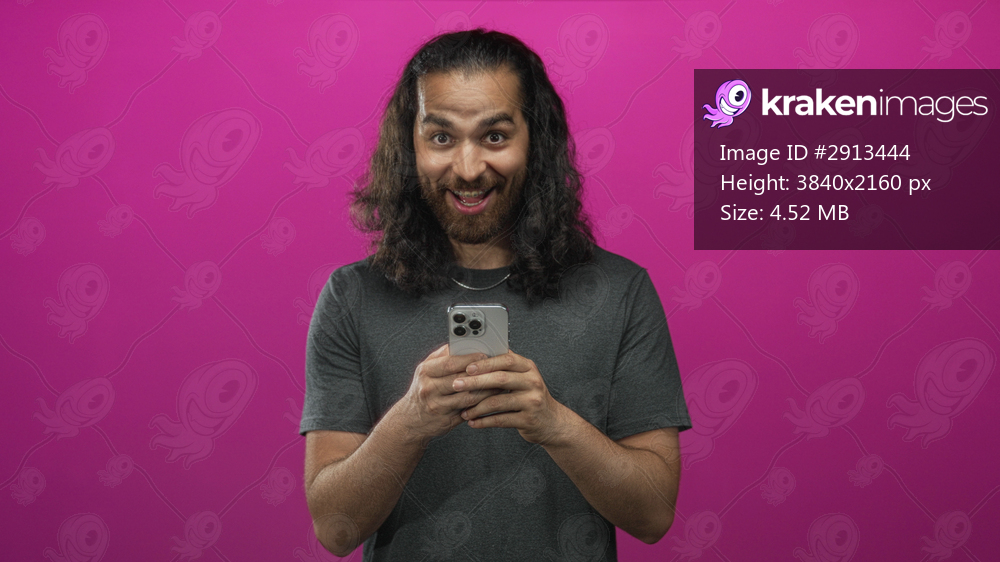 Young man of arab hispanic appearance holding smartphone while smiling and typing in a studio with magenta wall; digital connection joy.