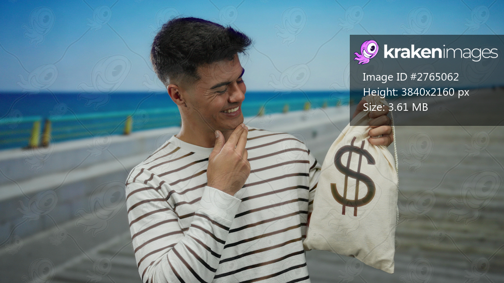 Young man on a seaside promenade holds a bag with a dollar sign, exuding confidence and charm while enjoying the outdoor atmosphere.