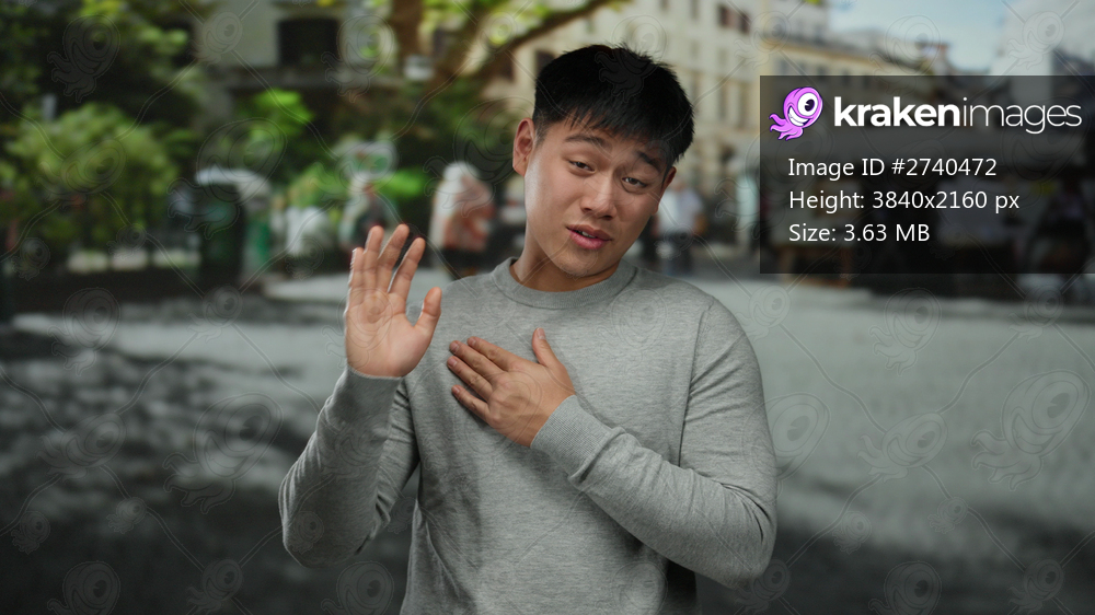 Young man on city street gesturing emotionally with pedestrians in background, suggesting energetic urban ambiance in a modern outdoor setting.