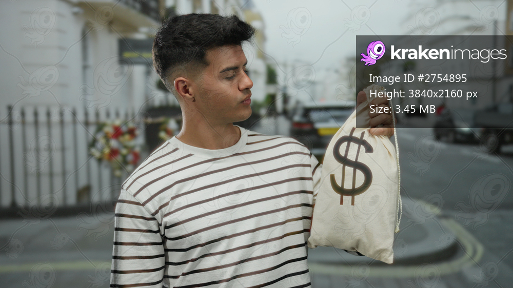 Young man on city street holding money bag symbolizing wealth and success with a confident expression in an urban outdoor setting.