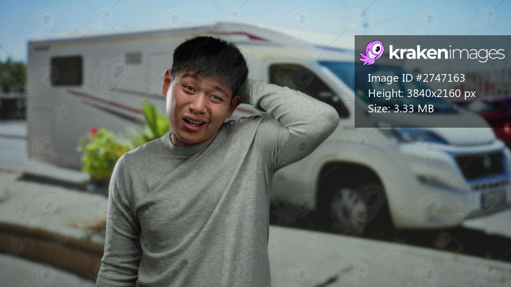 Young man on city street in front of parked camper, expressing confusion while scratching his head under the bright sunny sky.