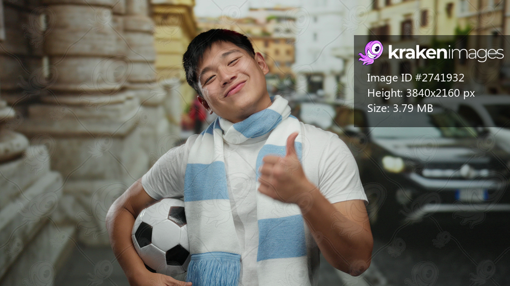Young man on city street smiling with soccer ball and wearing scarf giving thumbs up vibe of confidence and enthusiasm; backdrop urban buildings and parked cars. - Kraken Images
