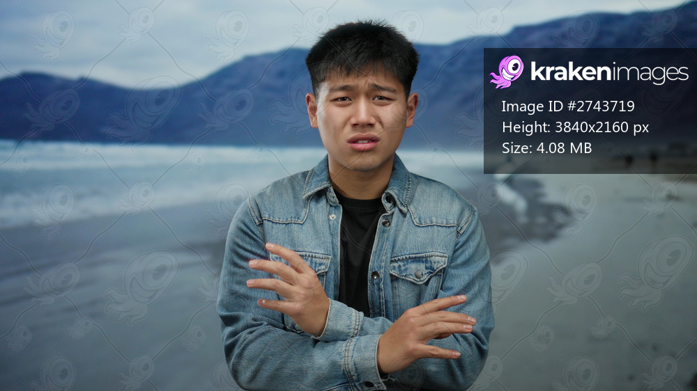 Young man on seaside beach gesturing with fingers in denim jacket against ocean and mountains in background