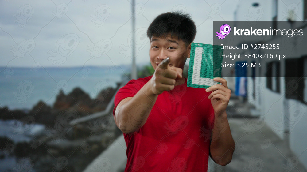 Young man on seaside promenade holding learner sign outdoors with a confident smile and index finger pointing towards the camera against a scenic coastal backdrop. - Kraken Images