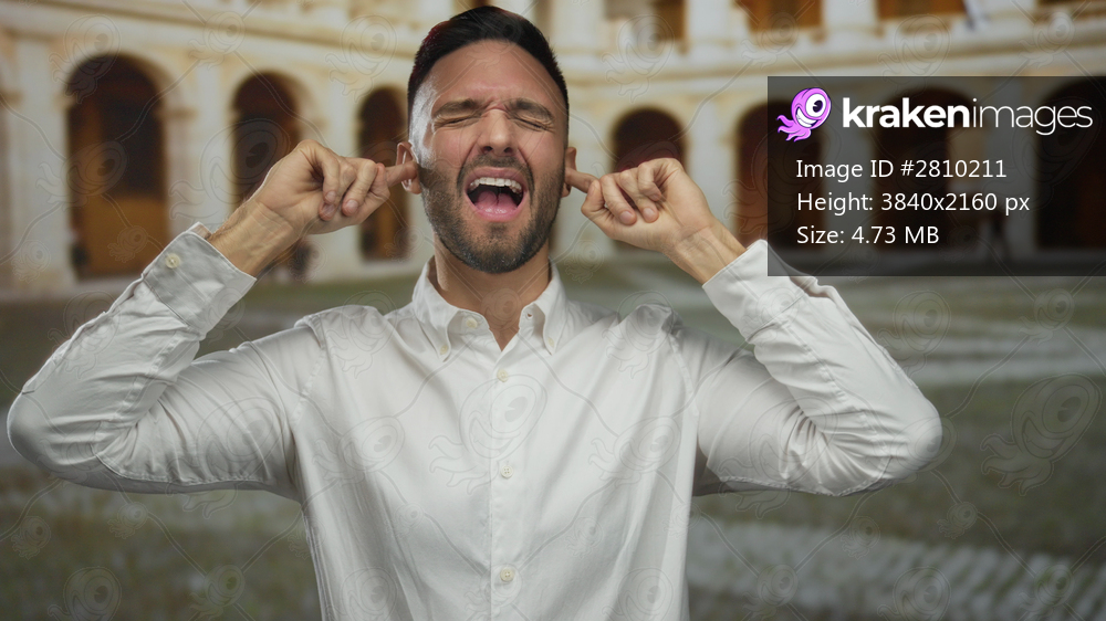 Young man on university campus covering ears with fingers in front of old building courtyard, expressing frustration vividly while wearing a white shirt. - Kraken Images