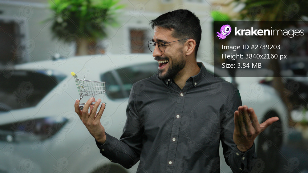 Young man on urban street holding toy shopping cart with expressive gesture, showcasing contrast between modern city life and small scale consumerism.