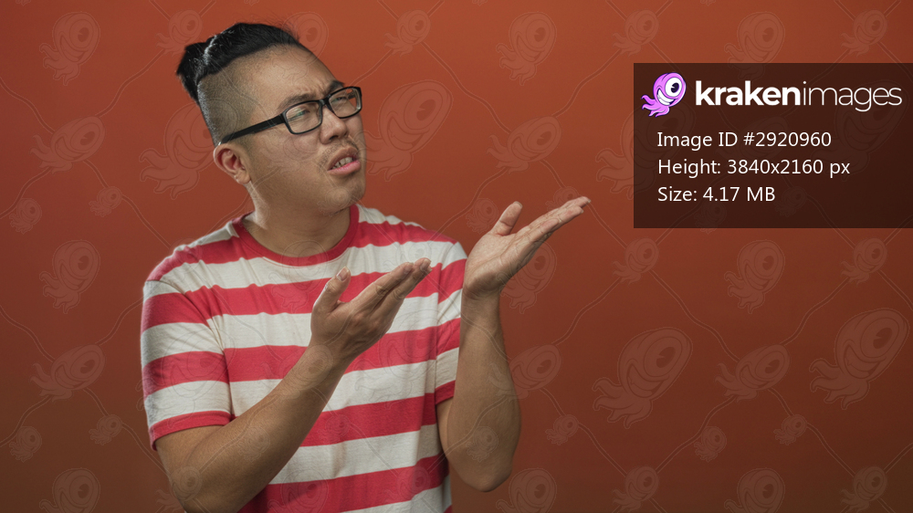 Young man with open palms gesture and glasses in studio against an orange wall wearing a red and white striped tee, looking puzzled; confusion.