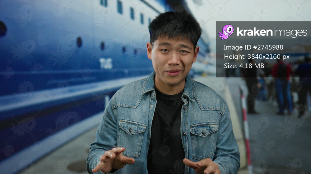 Young man outdoors by a boat in a port setting, expressing a narrative with surrounding sea and seaside atmosphere, hinting at a maritime theme and casual attire. - Kraken Images