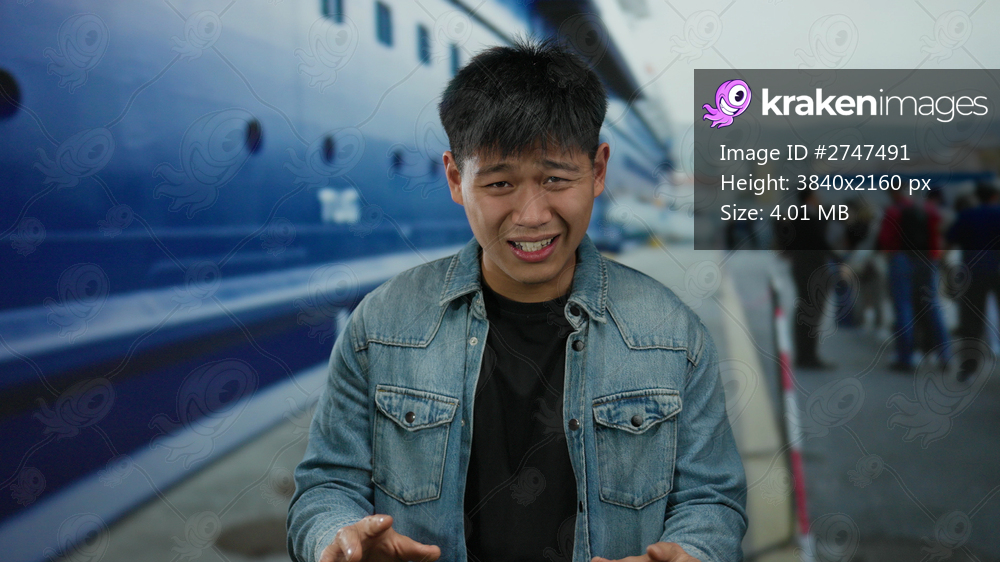 Young man outdoors by a boat in a port setting, expressing a narrative with surrounding sea and seaside atmosphere, hinting at a maritime theme and casual attire. - Kraken Images