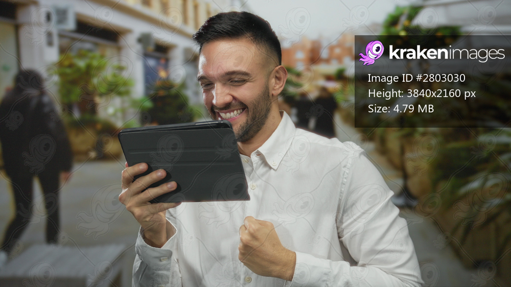 Young man outdoors celebrating success on tablet in urban street setting with a joyful expression and confident posture.