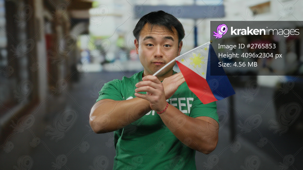 Young man outdoors holding philippines flag in urban street setting wearing green volunteer shirt expressing gesture of awareness and engagement