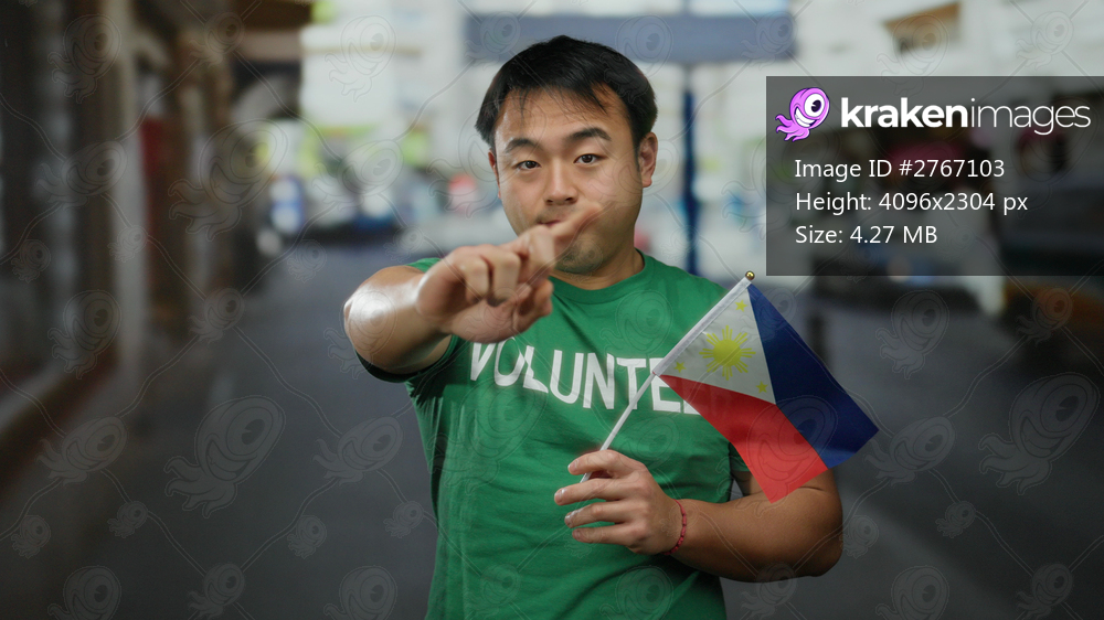 Young man outdoors holding philippines flag in urban street setting wearing green volunteer shirt expressing gesture of awareness and engagement