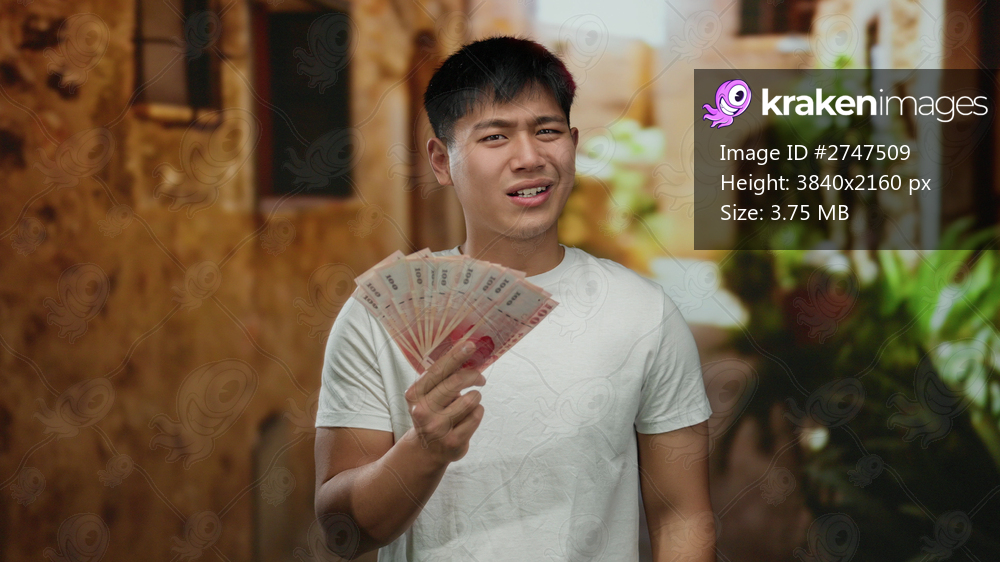 Young man outdoors holding taiwanese dollars with a thoughtful expression on a city street background.