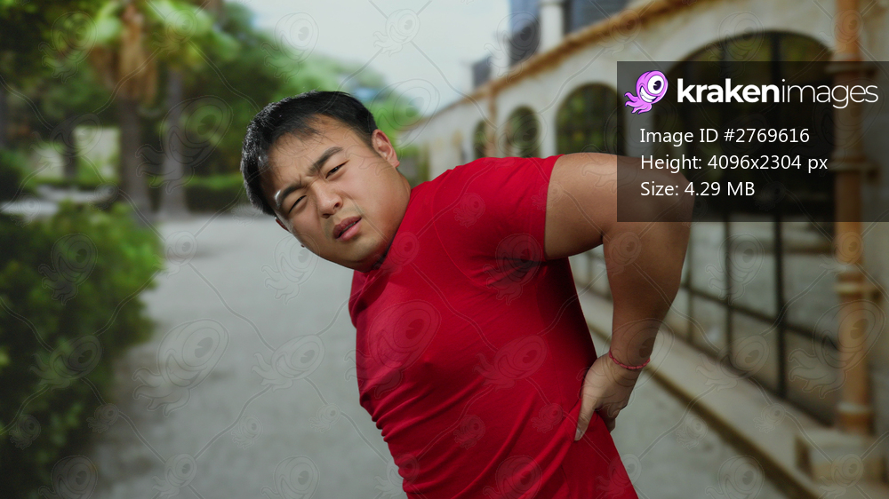 Young man outdoors in a vibrant urban setting showing signs of back pain while dressed casually in a red shirt.