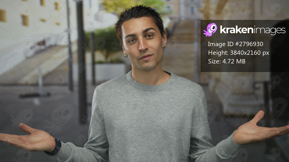 Young man outdoors in casual attire gestures with a questioning expression in an urban setting indicating confusion or ambiguity