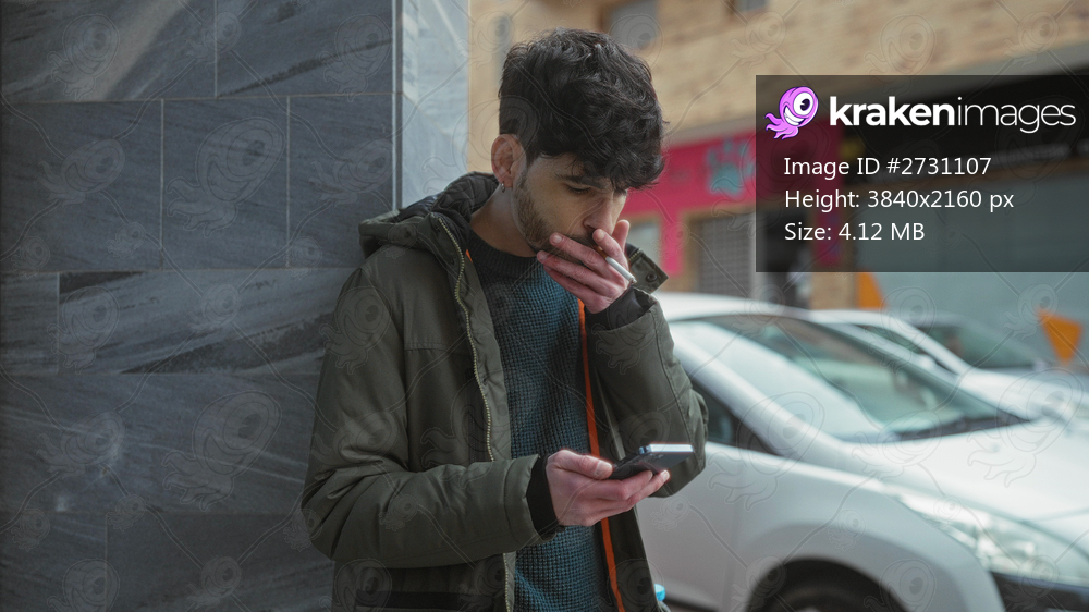 Young man outdoors in urban setting smoking and using smartphone on city street by parked cars in winter attire expressing modern city lifestyle and technology interaction. - Kraken Images