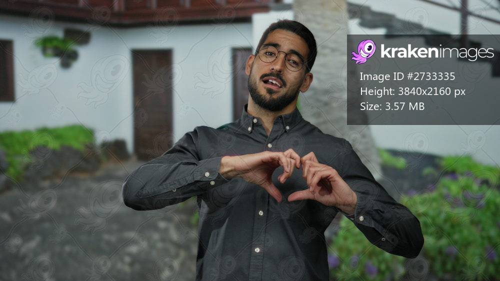 Young man outdoors in urban town making heart gesture wearing glasses and dark shirt showing positive emotion and friendliness in exterior setting.