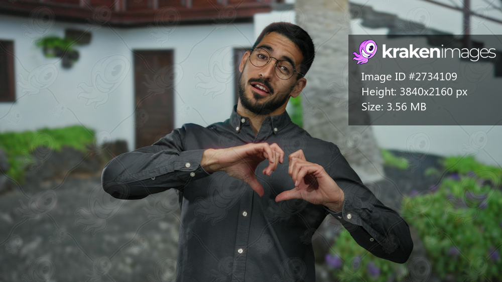 Young man outdoors in urban town making heart gesture wearing glasses and dark shirt showing positive emotion and friendliness in exterior setting.