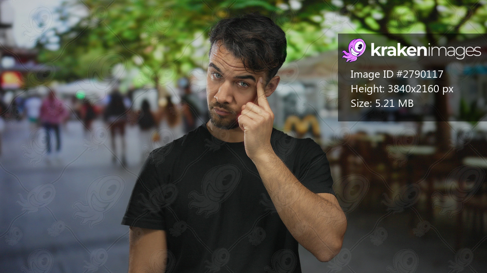 Young man outdoors on terrace at restaurant with trees and people in background, playfully pointing and thinking in casual setting