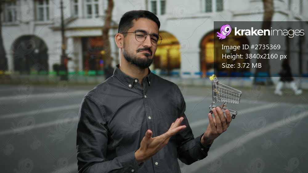 Young man outdoors on urban street holding small shopping cart with a skeptical expression showcasing modern city lifestyle and consumer behavior