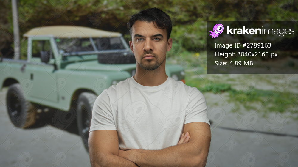 Young man outdoors standing confidently near off-road vehicle with arms crossed, wearing white shirt, under a green forested background during a sunny day. - Kraken Images