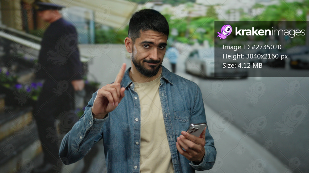 Young man outdoors using smartphone on a city street, expressing emotions with gesturing, wearing casual denim, surrounded by urban life and people in the background. - Kraken Images