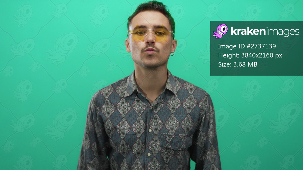 Young man with patterned shirt and yellow glasses standing against a vibrant green background looking confident and stylish in an isolated setting.