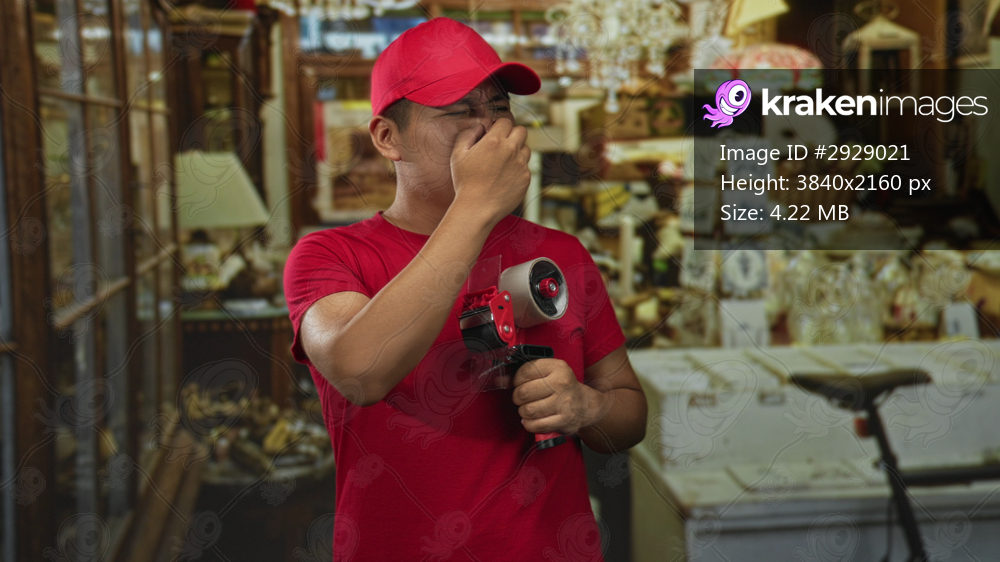 Young man pinched nose holding packing tape dispenser inside a building shop with cluttered shelves; disgust.