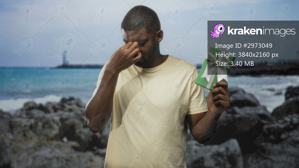 Young man pinches nose while holding a green wrapped gift box beside rocky shoreline with distant lighthouse on beach; disgust regret.