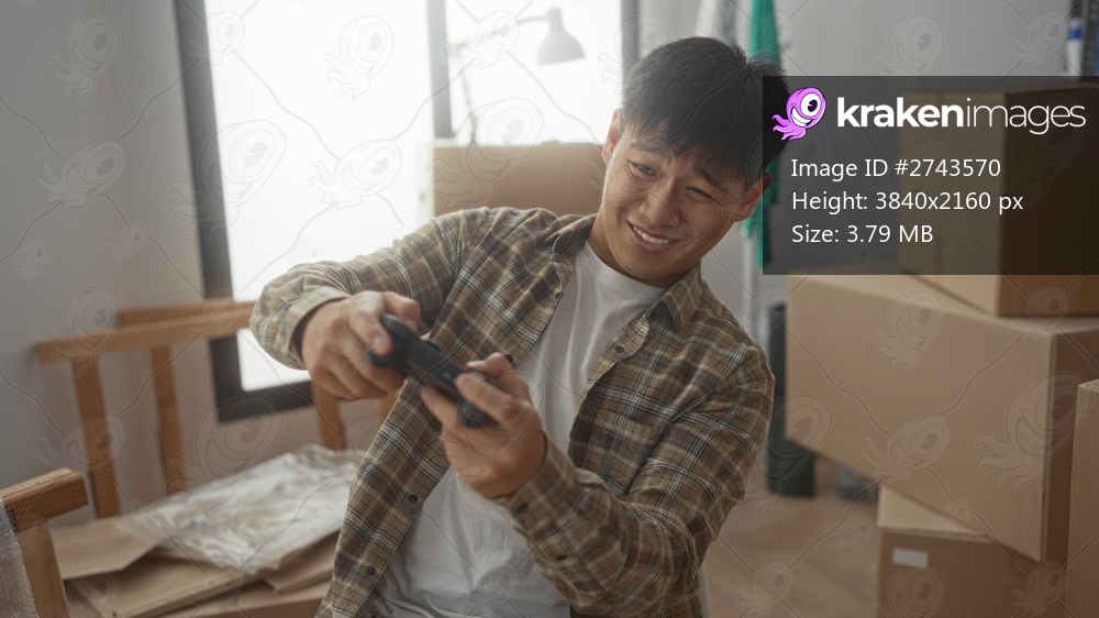 Young man playing video games in new home surrounded by boxes in a bright living room, depicting a fresh start and leisure.