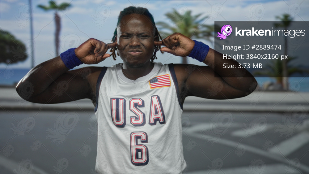Young man plugging ears with fingers on seaside street wearing usa basketball jersey and wristbands; frustration noise discomfort.