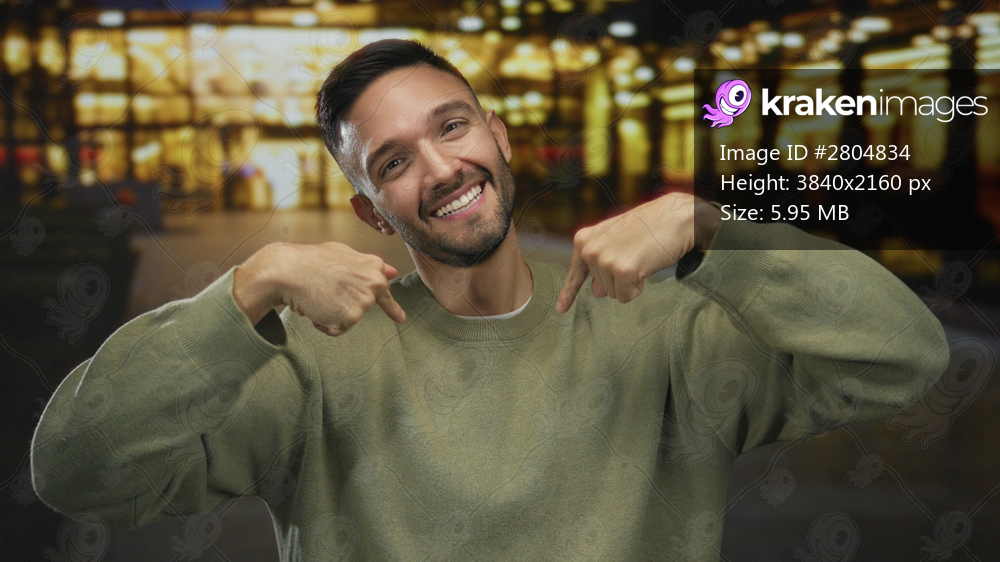 Young man pointing at himself and smiling on an urban city street with blurred lights in the background showcasing a lively outdoor atmosphere.