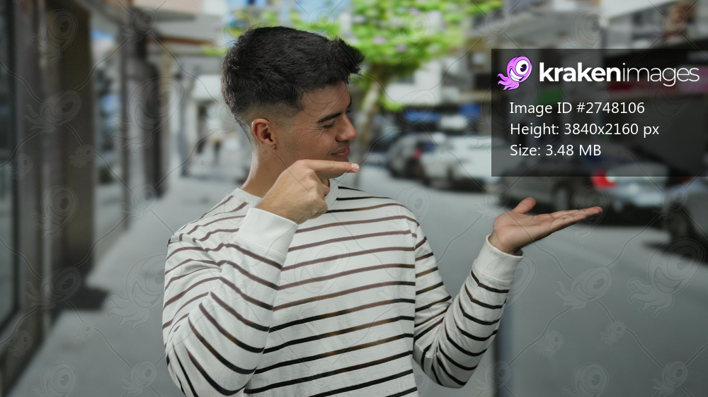Young man pointing at palm on city street, wearing striped shirt, capturing an outdoor urban vibe with a confident and engaging pose.