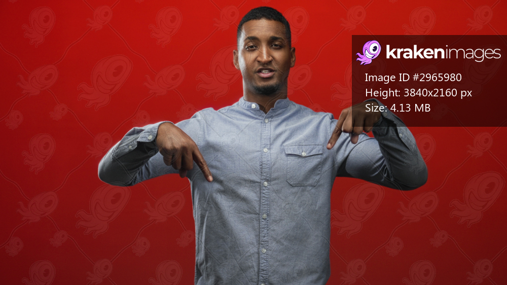 Young man pointing both index fingers down toward his shirt pocket while facing camera in studio; confidence.