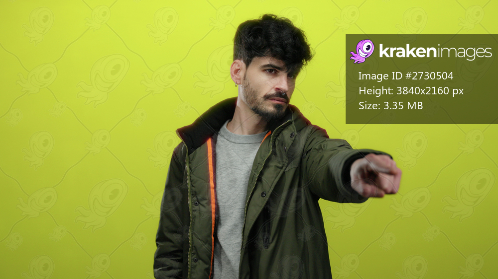 Young man pointing with confidence against a bright yellow background, wearing a stylish green jacket, exuding a charismatic and assertive demeanor.