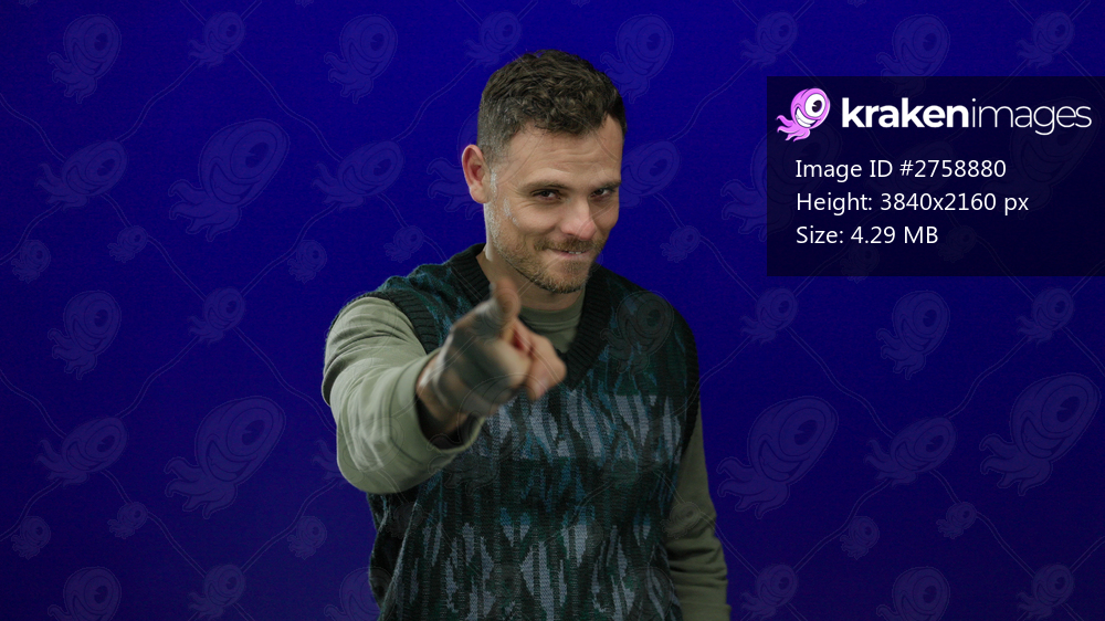 Young man pointing confidently against a vivid blue background, showcasing an engaging and attractive demeanor.