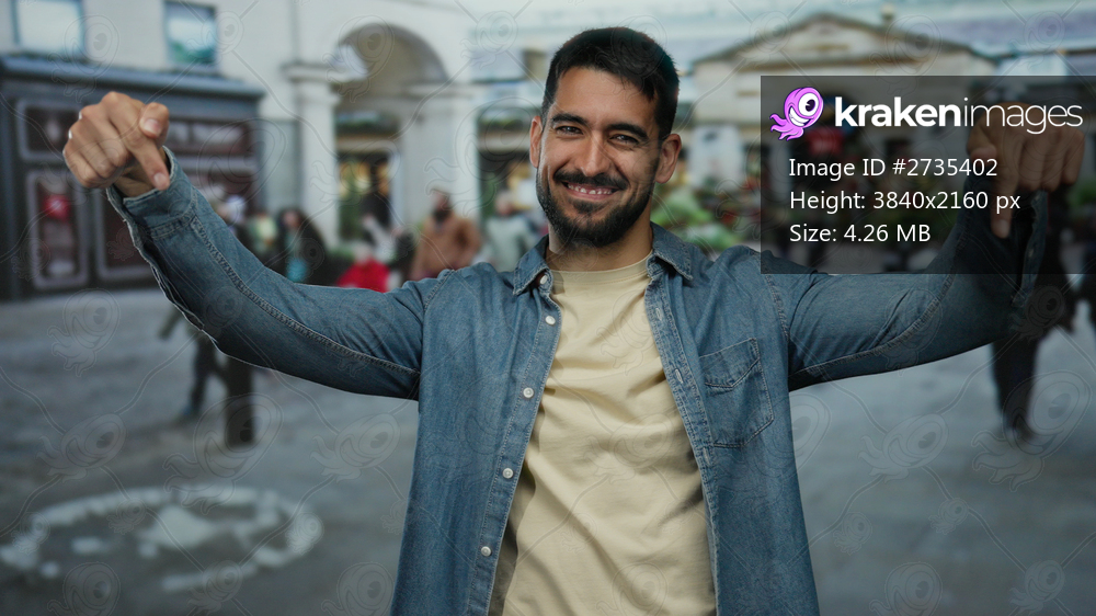 Young man pointing down with a smile in an outdoor urban street setting with blurred buildings and people in the background.