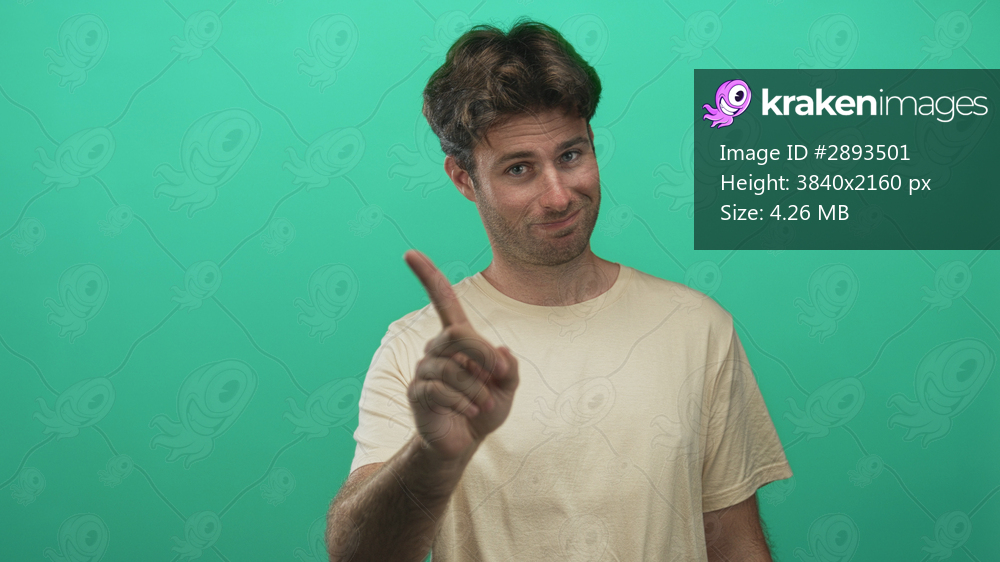 Young man pointing finger at camera in studio with bright green backdrop and casual t shirt; skepticism.