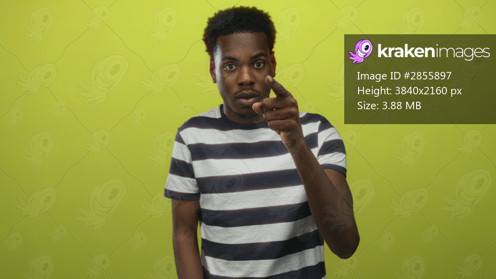 Young man pointing finger in studio wearing striped shirt with serious gaze; seriousness assertion intensity.